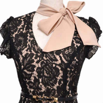 首元のリボンがエレガントなムードを漂わせ、レース素材ともマッチしたキャバドレスです。
