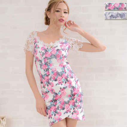 キャバドレス ミニ キャバクラドレス Jewel ジュエル 水彩画風花柄 袖レース ミニドレス 258162651