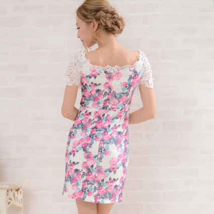 【Jewel ジュエル 水彩画風花柄 袖レース ミニドレス】