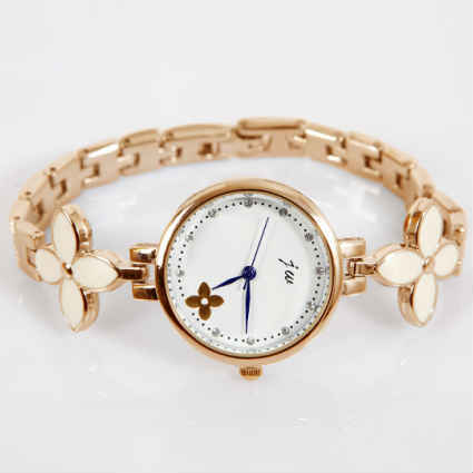 文字盤にあしらわれたラインストーンが、さりげなくエレガントな印象を与え、ベルトのフラワーモチーフとマッチした腕時計です。