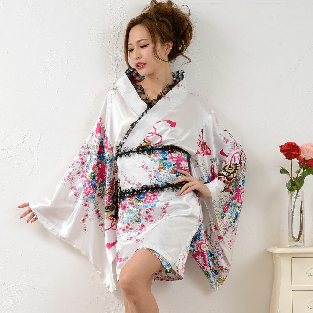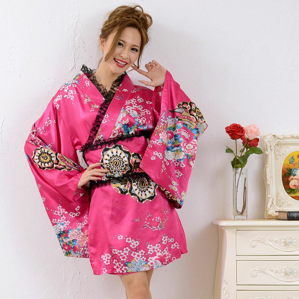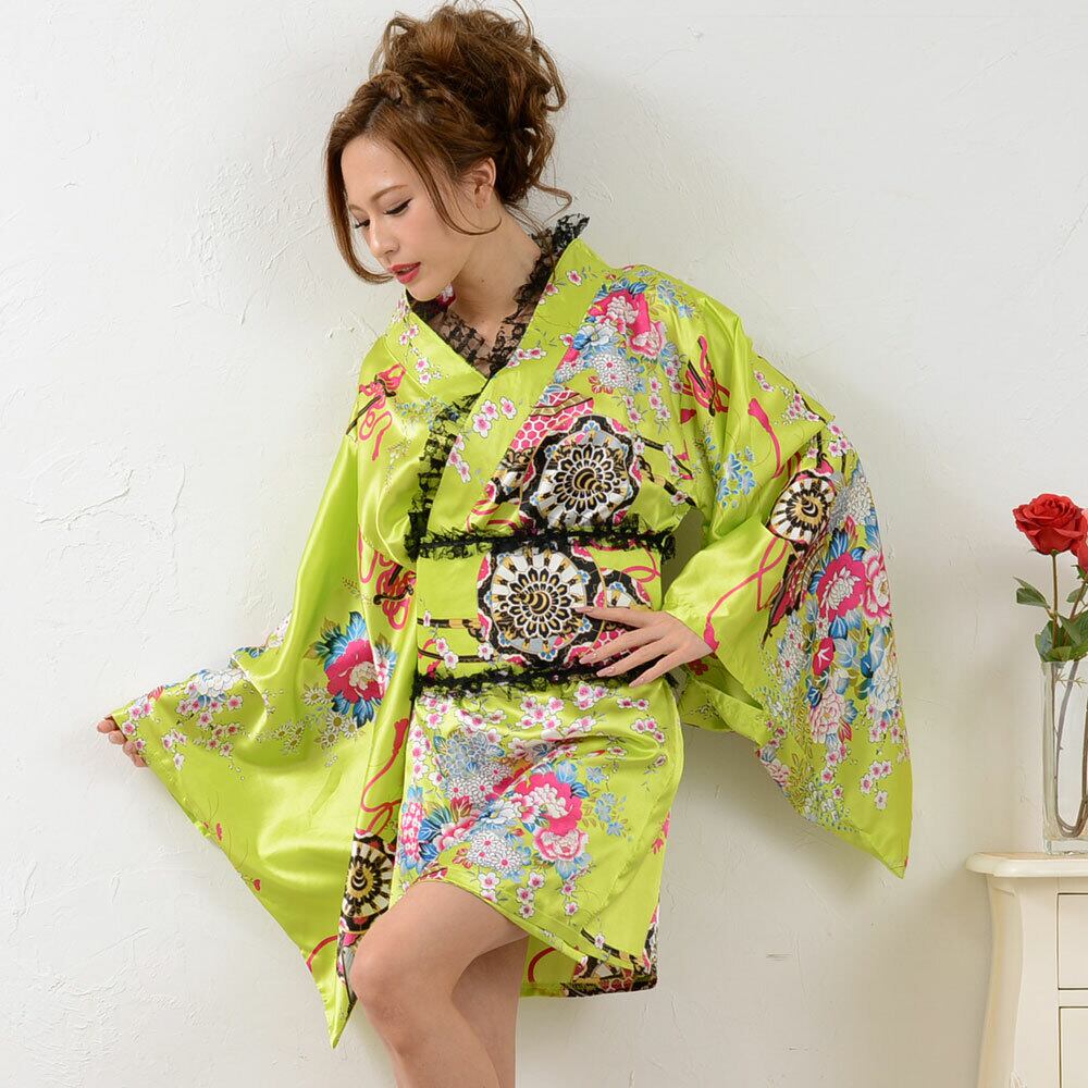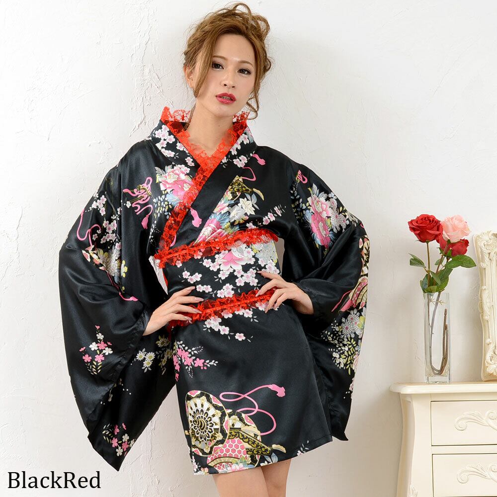 素材はポリエステルサテンなので光沢感が有りセクシーさを演出し、衿、帯部分にレーストリミングが施されていてキュートさも兼ね備えています。