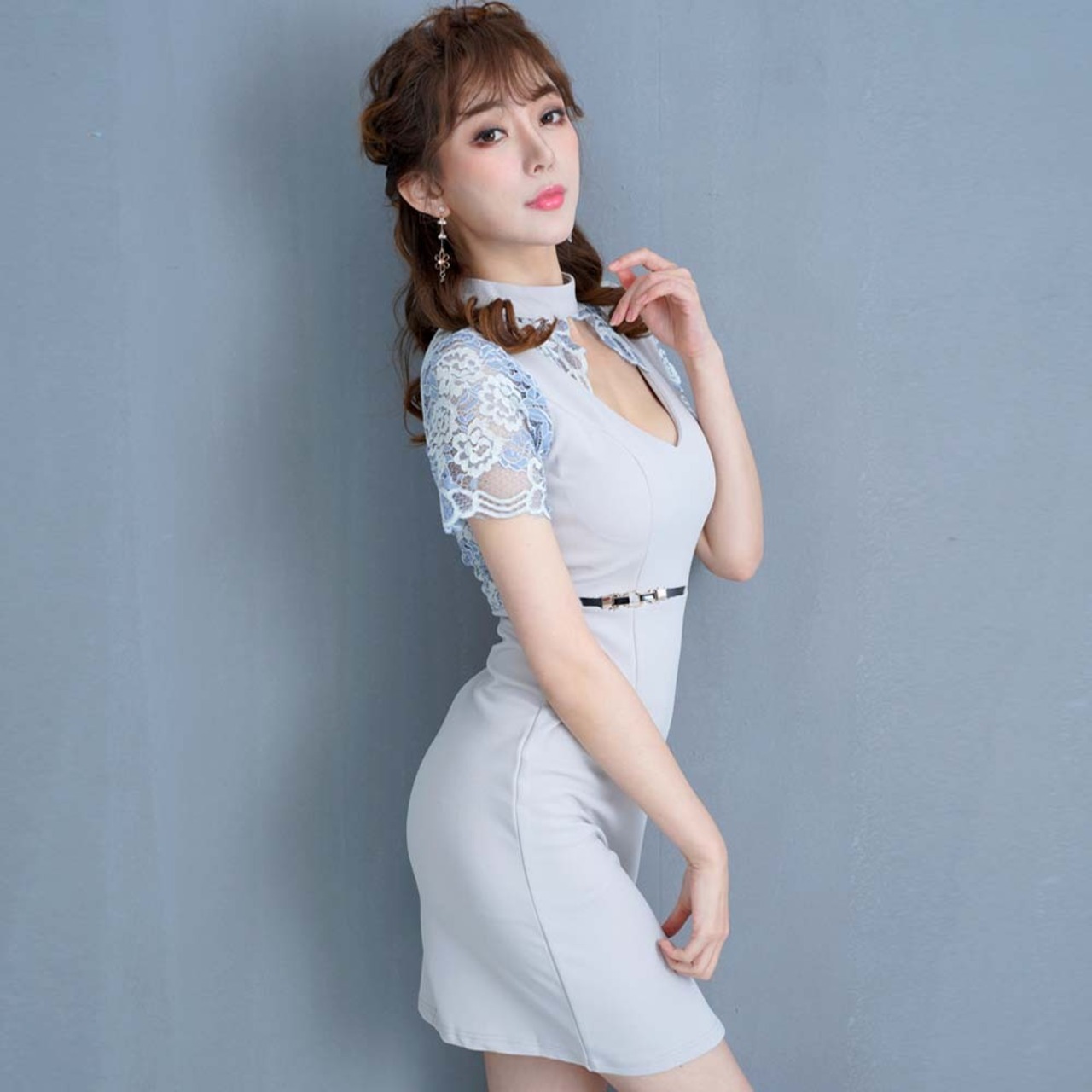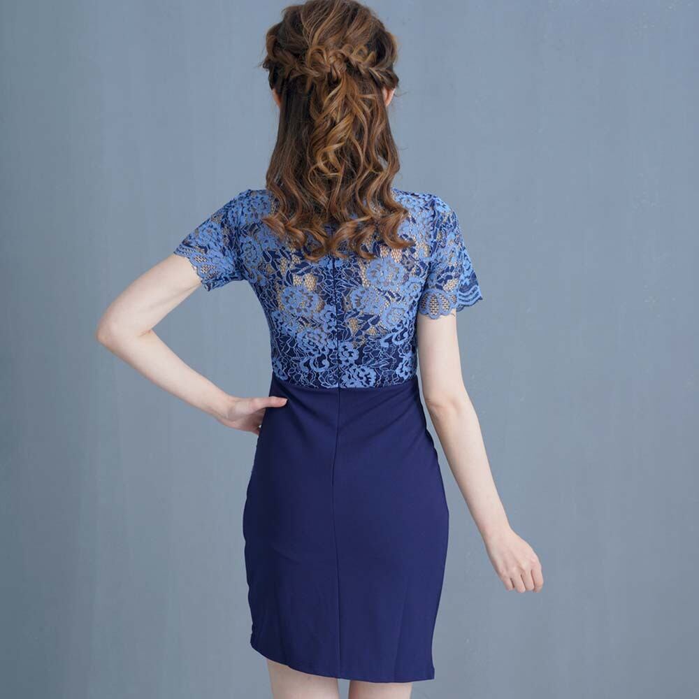 部分レース素材がエレガントさを演出し、アシメトリーになったスカート部分のスピンドル仕様がスタイリッシュな雰囲気も醸し出したドレスです。