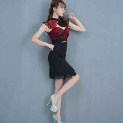 また衿元のリボンとスカート部分のレーストリミングがキュートさも演出し、更にウエストを細ベルトでマークする事により、脚長効果とメリハリボディーを演出してくれます。