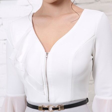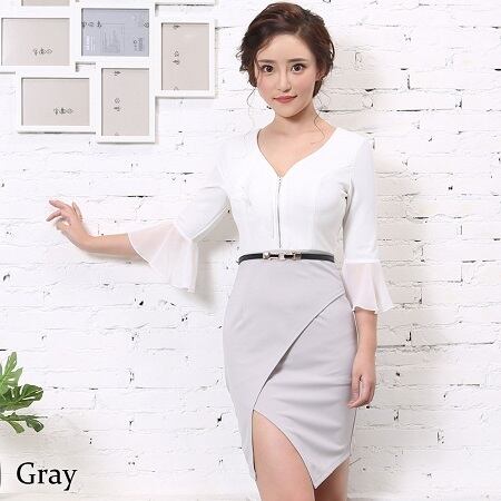 フロントのジップがクールな印象を与え、右バスト部分のフリルがエレガントな印象も与えるドレスです。