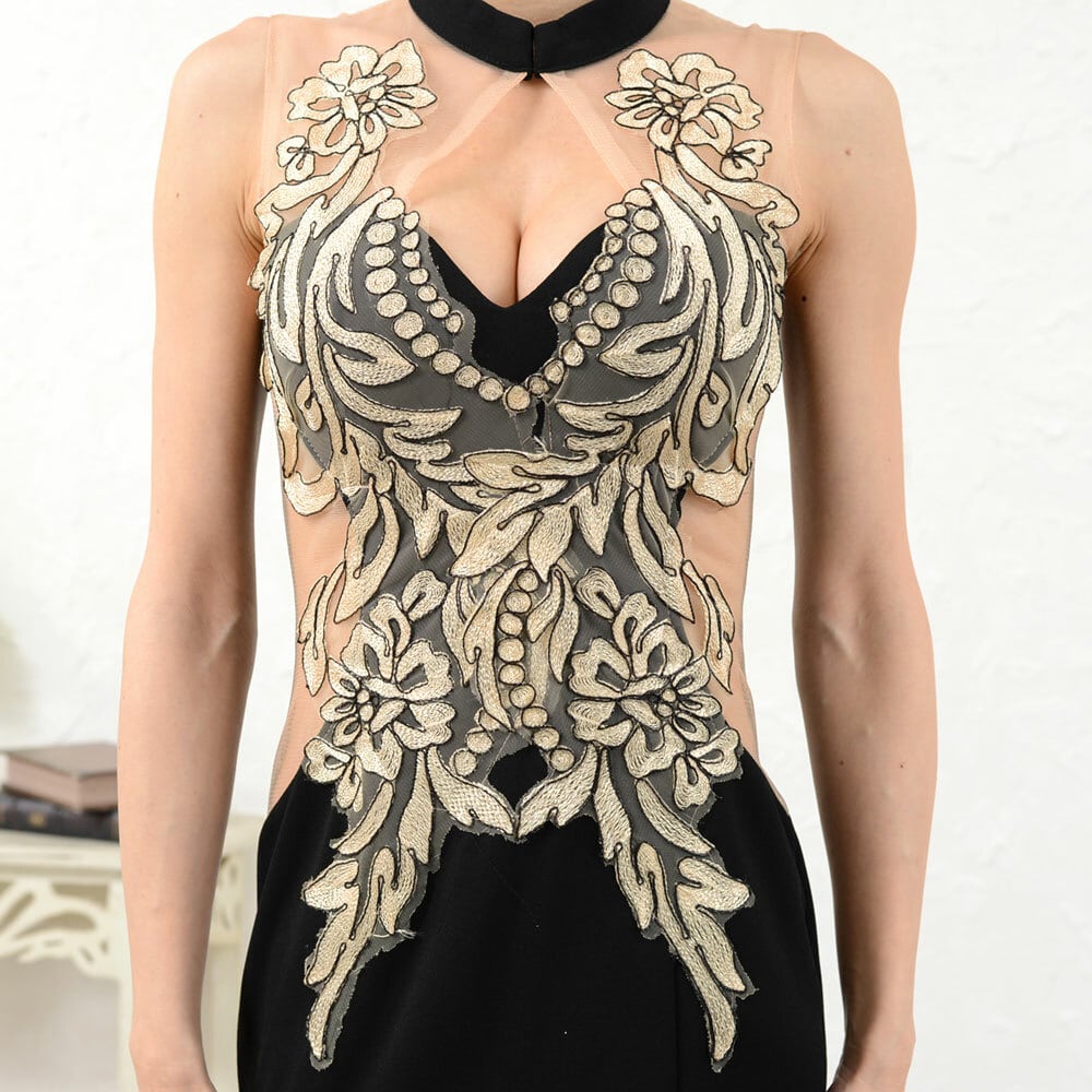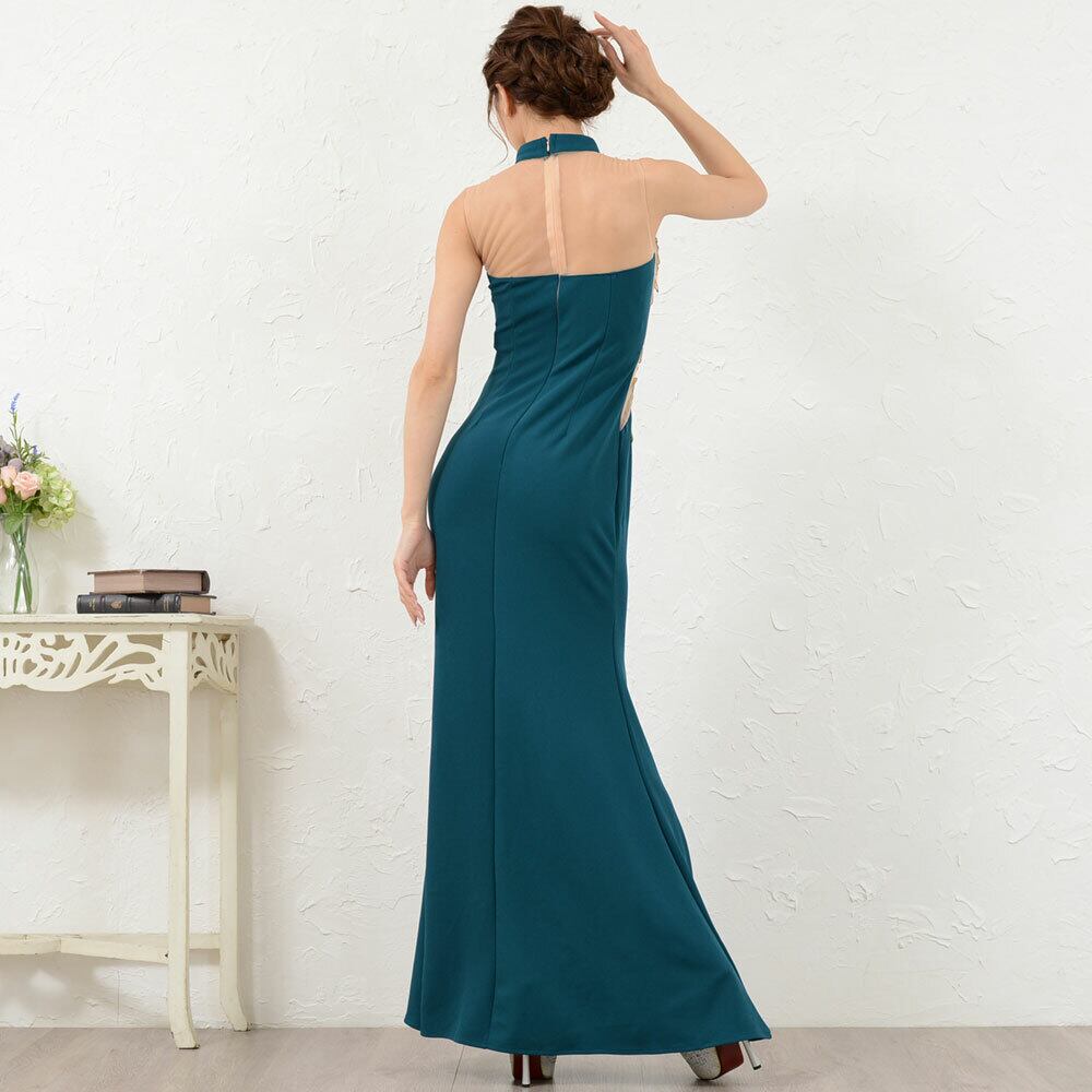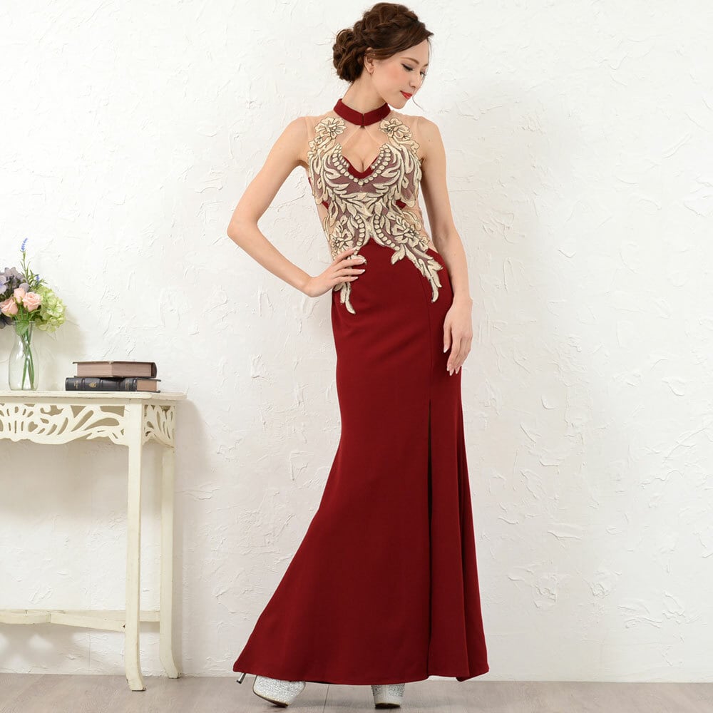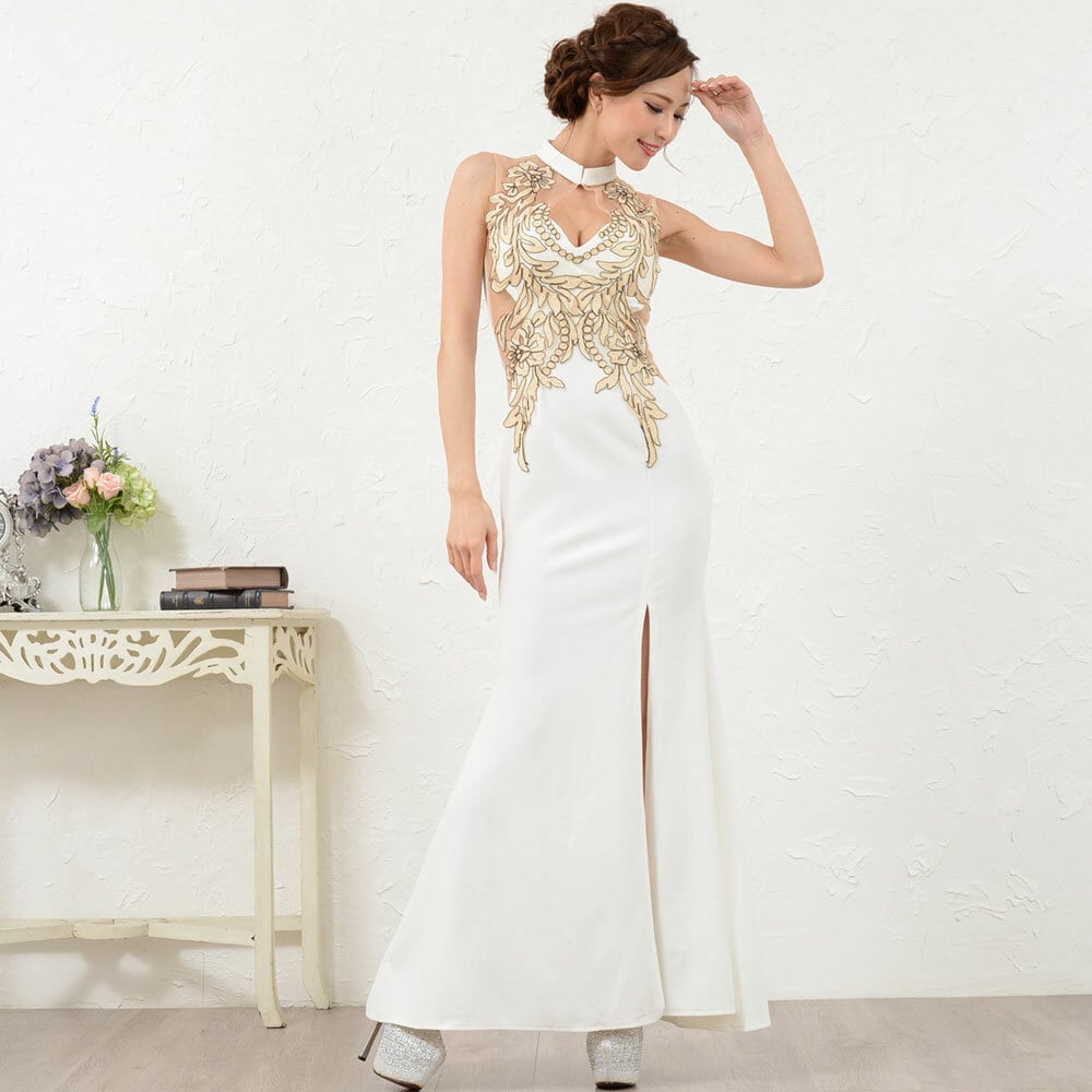 フロントのゴールドの刺繍がゴージャスでエレガントなムードを漂わせたロングドレスです。