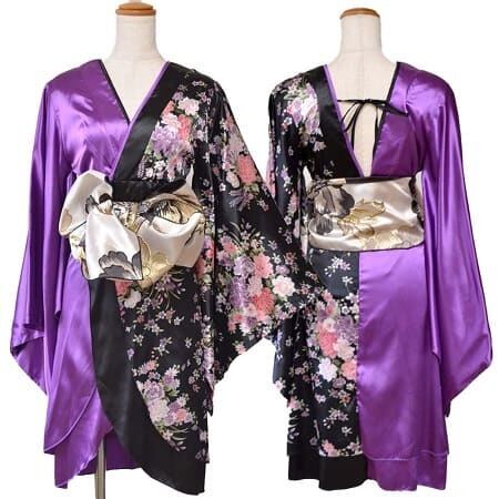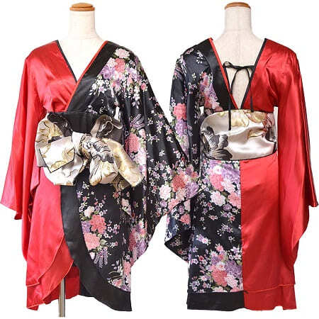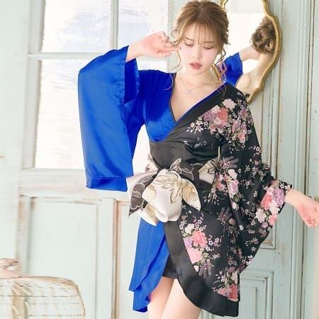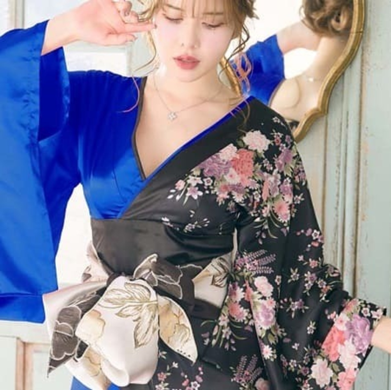 花柄のワンピースタイプのアシメトリー着物ドレス。