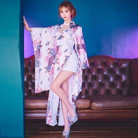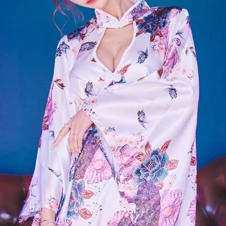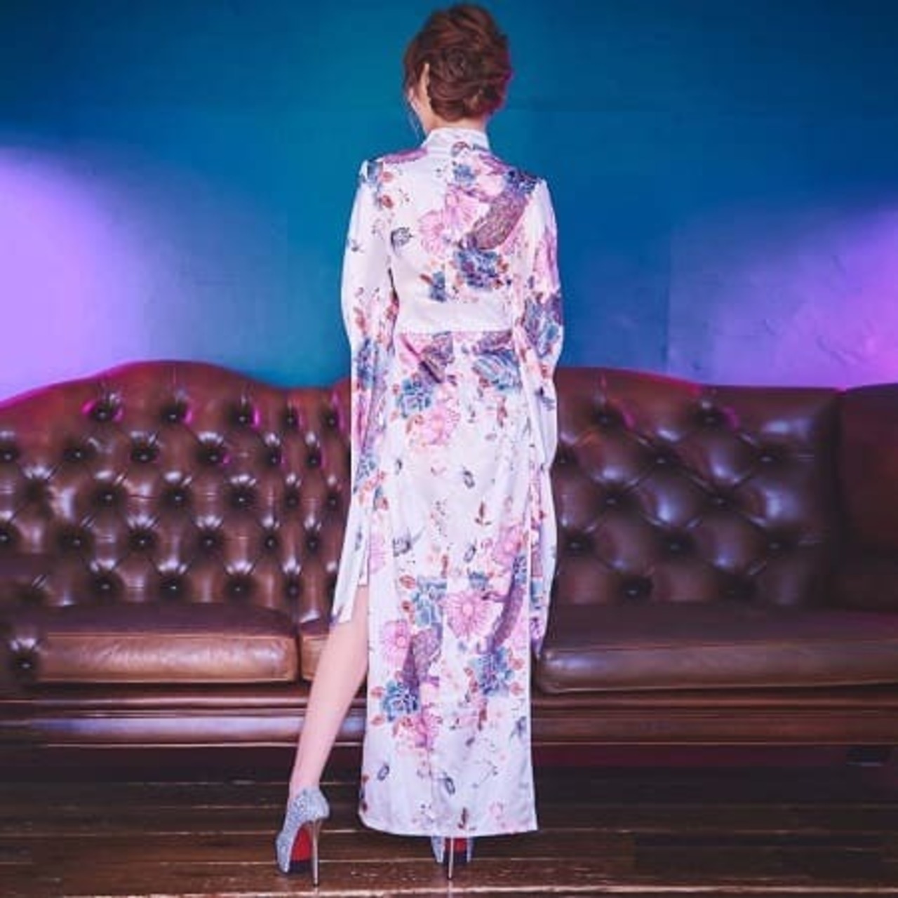 孔雀柄のチャイナ風、ミニイン着物ドレス。